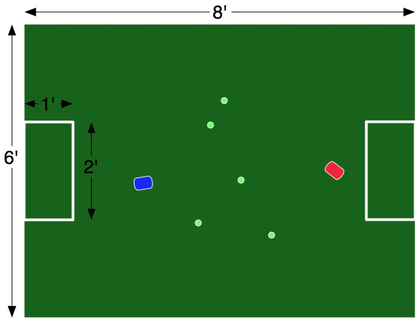 The competition this year is called "Tiger Scramble". There are two robots on an 8'x6' playing surface, and the object of the competition is to possess three balls simultaneously by placing them into the robots' respective goal area. More details are available on the class web site.
